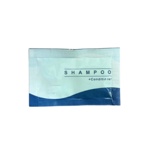 Pavy brand 2-in-1 Shampoo & Conditioner packets in 0.34 oz (10 ml) single-use format, providing guests with an all-in-one hair
